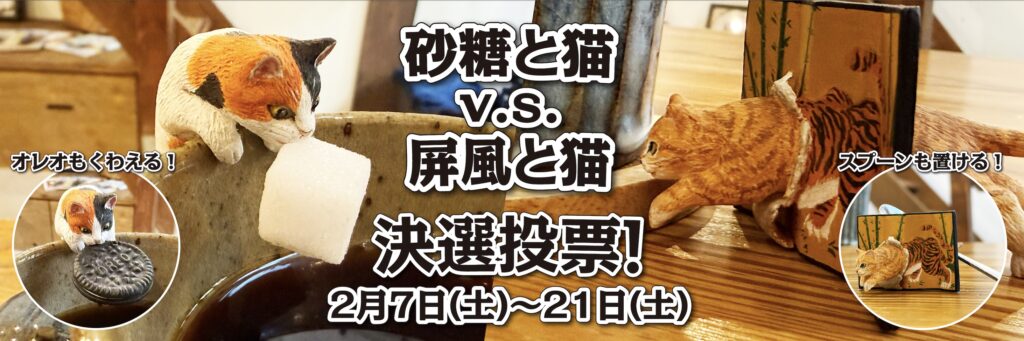 第2回カフェ猫フィギュア選挙、『砂糖と猫』v.s.『屏風と猫』、始まる 〜結果発表は2月22日・猫の日〜