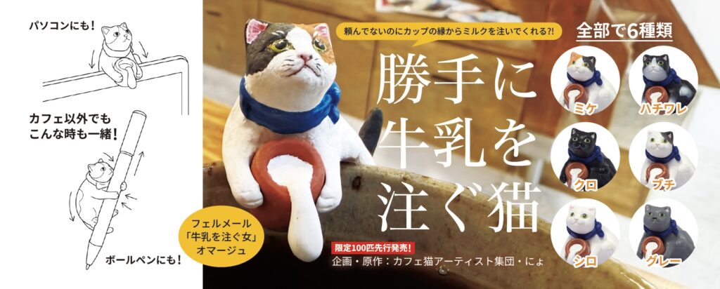 PLAN35株式会社と株式会社照應堂は、カフェ猫フィギュア「勝手に牛乳を注ぐ猫」を、2026年2月22日(猫の日)より、東京・清澄白河のno mark.Cafeにて100体限定で先行発売いたします。本商品は、昨年2月の猫フィギュア総選挙で選ばれた「勝手に牛乳を注ぐ猫」を原型とし、2026年6月にブルーマウンテン社により全国でのガチャガチャ展開を予定しているカプセルトイモデルとなります。今回の先行発売では、ガチャ機(ガチャマシン)を使用せず、箱の中から商品を取り出す「体験型くじ形式」にて販売いたします。カフェ猫アーティスト集団“にょ”により誕生した「勝手に牛乳を注ぐ猫」のカプセルトイをぜひお楽しみ下さい。